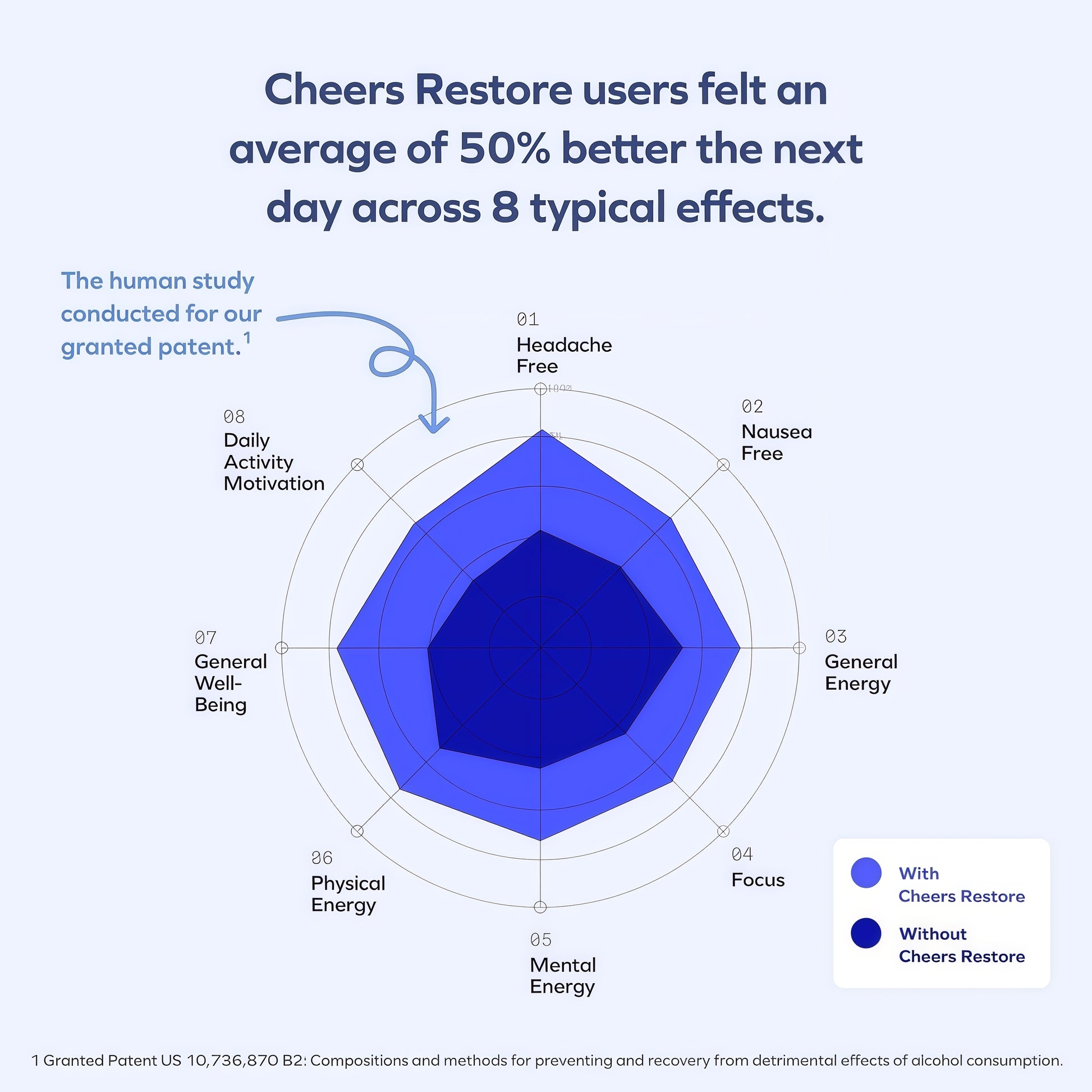 Unfortunately, there’s no product out there that will magically wipe away your 15-drink night the next morning. You’ll feel better, but still not great... However, we have some good news for those moderate, responsible drinkers out there. Expect to feel at least 50% better! In a human study conducted for our granted patent, Cheers Restore users felt an average of 50%+ better the next day across 8 typical symptoms. So, if you usually feel 30% the day after drinking, expect to feel 80% (or your money back)!* Even better–Cheers Restore has the leading amount of third-party tested DHM per dose (1200mg!), so you know that you’re getting the most effective product on the market.